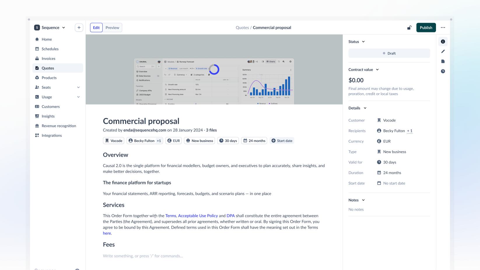 Sequence sales quoting is like a notion page supercharged with pricing tools. We help companies launch pricing proposals, order forms or contracts directly from Salesforce or Hubspot. Once e-signed through a seamless workflow, pricing data is captured in a structured database for finance teams to do 1 click billing and manage other revenue related finance workflows.