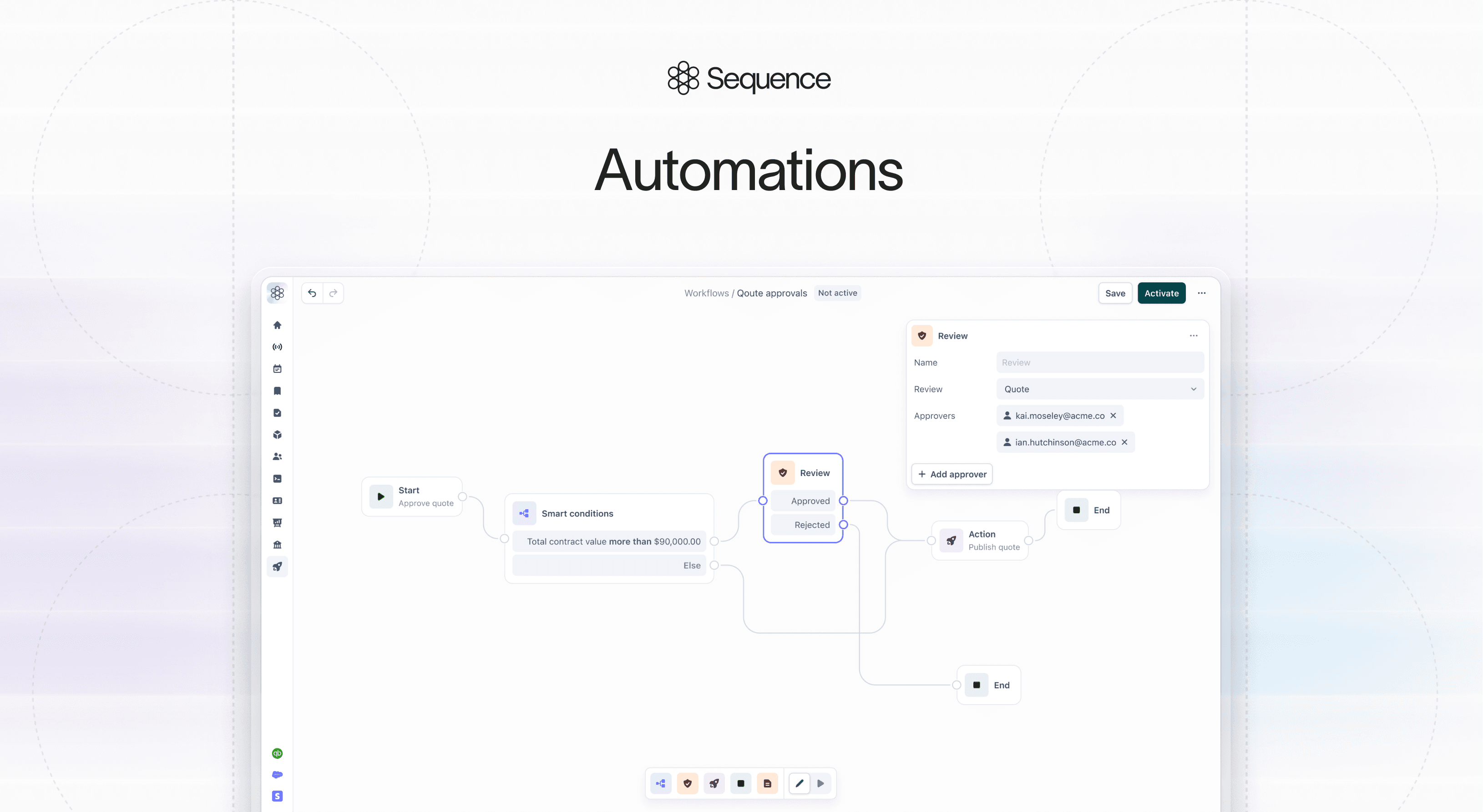 Workflows let you design quote approvals, contract intake, and other multi-step processes on a visual canvas. When a run requires human review, it sends a notification to Watchtower.