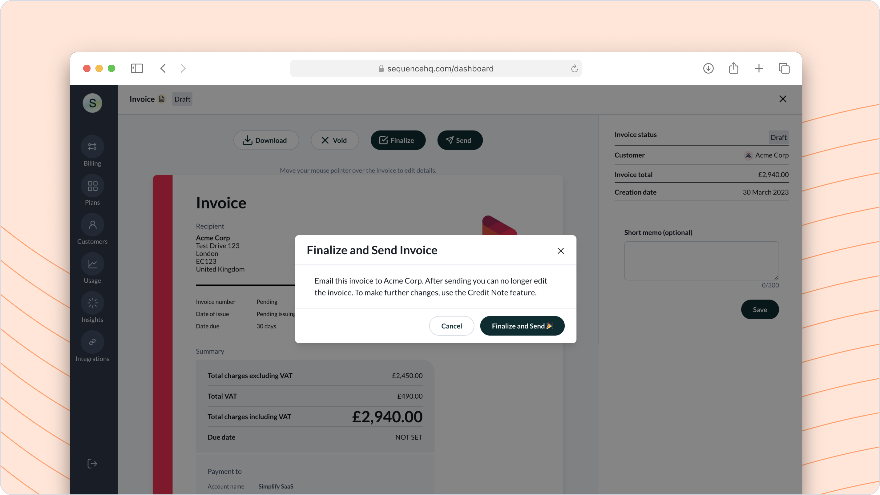 The Improved Invoice finalizing, sending, and voiding feature enhances control over the invoice lifecycle, offering a one-click solution to manage invoices and credit notes. This update streamlines invoice processing, making it more efficient for operators to handle various invoice actions swiftly. It's a significant enhancement for businesses looking to optimize their billing workflows, ensuring more accuracy and speed in financial operations within Sequence.